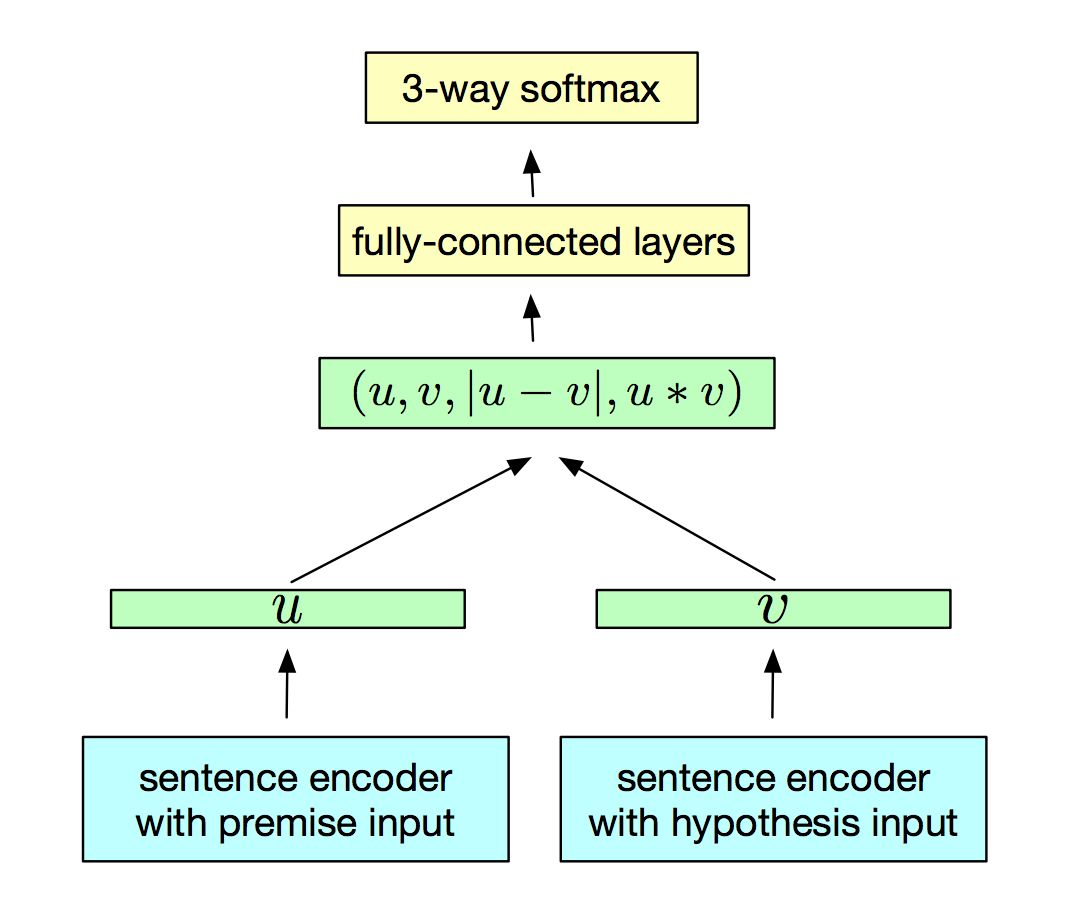 这个框架最底层是一个 Encoder,也就是最终要获取的句子向量提取器,然后将得到的句子向量通过一些向量操作后得到句子对的混合语义特征,最后接上全连接层并做 SNLI 上的三分类任务。