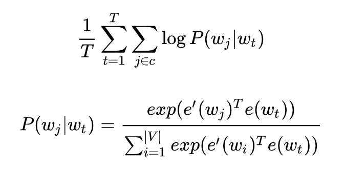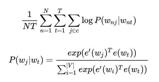 可以看出目标函数中有两个求和符号,最里面的求和符号的意义便是让当前的输入词分别和该词对应语境中的每一个词都尽量接近,从而便可以表现为该词与其上下文尽量接近。