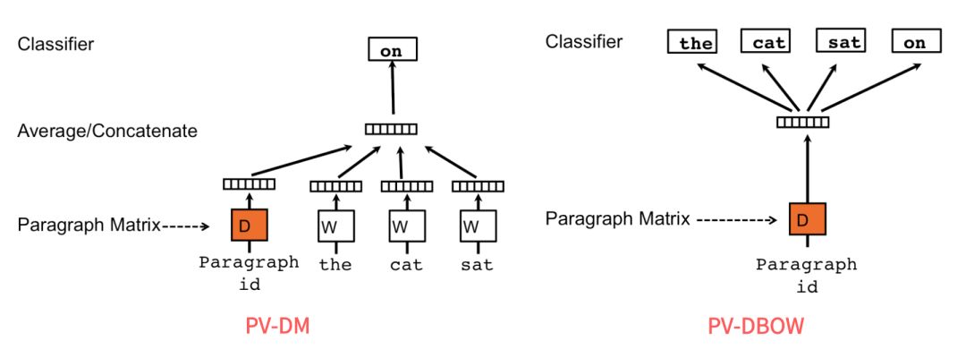 word2vec 开源随后的第一年,也就是在 2014 年,还是 Mikolov,在他和另一位作者合作的一篇论文 Distributed Representations of Sentences and Documents 中,提出了可以借鉴 word2vec 思想的两种结构:PV-DM 和 PV-DBOW,分别对应 word2vec 中的 CBOW 和 Skip-gram。