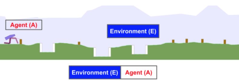 Uber 发布了 Paired Open-Ended Trailblazer (POET),它结合了这些想法,明确地将这一系列研究推向生成新的任务、优化解决方案,以及在任务间迁移智能体,以实现其它方案无法取得的进展。为了证明这一方法,Uber 研究人员将 POET 用于创建和解决两足步行环境(改编自 OpenAI Gym 中的 BipedalWalker 环境),其中每个环境 E_i 与一个神经网络控制的智能体 A_i 配对,该智能体 Ai 尝试学习如何在该环境行走。下图展示了示例环境和智能体: