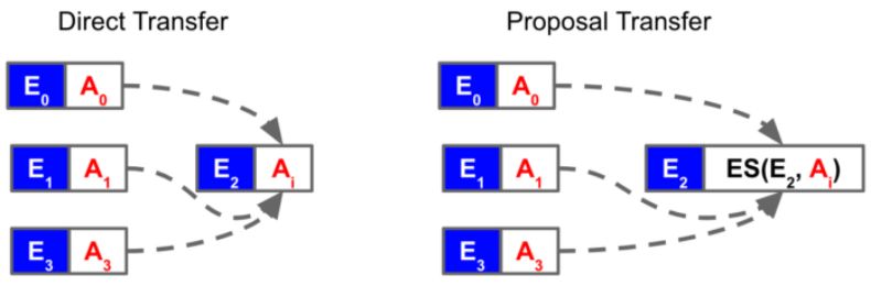 图 4:POET 有两种类型的迁移:直接迁移和提议迁移。只有迁移在目标环境上的性能优于当前配对智能体时,迁移才会发生(由虚线表示)。