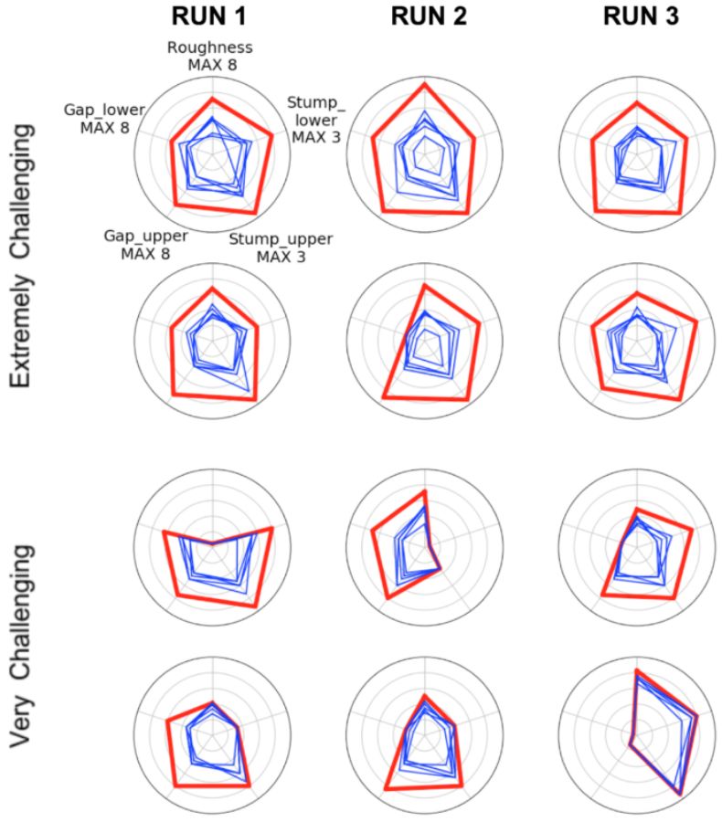 图 6 中的每个玫瑰图是一组实验,其中红色五边形表示 POET 创建和解决的环境。每个五边形的五个顶点表示粗糙度、间隙和障碍宽度的上下限。以红色五边形为目标,五个蓝色五边形表示五种独立运行的直接路径课程控制算法(使用相同的 ES 优化算法)能够解决的最接近目标的环境。课程从简单、平坦的环境开始,每当问题充分解决时(根据 POET 中的相同标准),环境会稍微改变,使其更接近目标环境(与 POST 相同的环境变化数量)。显然,控制算法不仅无法解决 POET 创建和解决的环境,而且可解决的环境范围比起 POET 的范围窄得多(这意味着 POET 智能体可以处理更广泛的多样性),这两者都证明了 POET 优于直接建立课程。