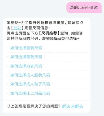 当用户输入“选的尺码不合适”时,其提问场景已经转变成用户收到货后,试穿之后发现尺码大了或小了,可能是需要退换货。而机器人返回仍然是如何选尺码的答案,很显然是打中了“选”和“尺码”两个关键字造成的误匹。从这个结果不难反推出如何选尺码的问题模板就是[选][尺码],只要用户输入的问句中包含这两个关键词,不管问的是什么问题,都会暴力匹配到这题。