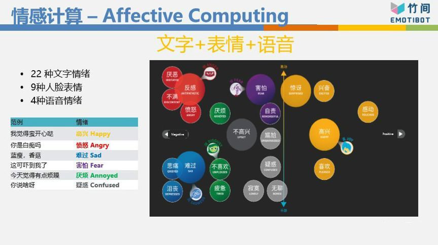 这其中很关键的一点,是识别用户的情绪。以上海的竹间智能为例,作为中国首家致力于打造与人类具有情感共鸣、懂得人类思想的情感机器人。竹间目前做了4种的语音情绪,人的表情做了9种,文字情绪做了22种。