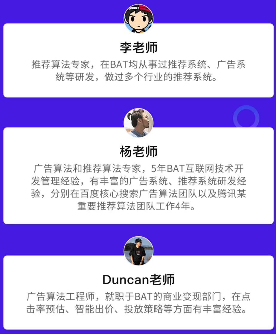 【推荐系统就业小班 第三期】 BAT大咖小班教学,保证就业! 由3位在BAT从业多年的团队核心大佬,定制化授课: ![]()