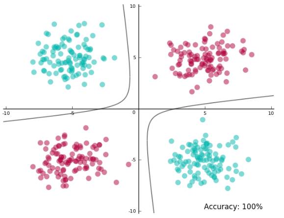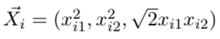 我之前已经很明确的提过,在某个地方出现了根号 2!在这个例子中,我想展示一下向高维空间映射的过程,因此我选了一个很具体的映射。一般而言,这是很难确定的。不过,多亏了 over』s theorem,我们能确定的是通过将数据映射到高维空间确实更可能使数据线性可分。