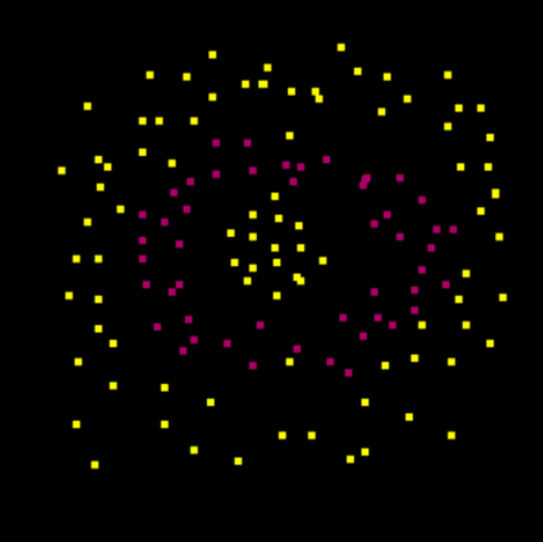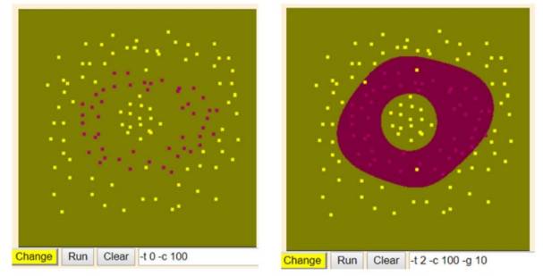 网站界面并没有展示分离边界,但会显示 SVM 判断分类标签的结果。正如你所见,线性核函数完全忽略了红点,认为整个空间中只有黄点。而 RBF 核函数则完整的为红点划出了两个圈!
