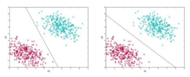 有一个很有趣的问题:以上两条线都将红色和绿色的点群集分离开来。有什么合理依据能让我们选择其中一个而舍弃另一个吗?