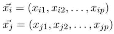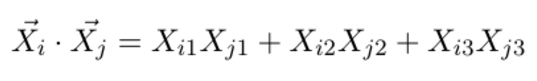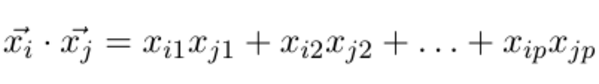首先 SVM 一个非常令人惊喜的方面是,其所有使用的数学机制,如精确的映射、甚至是空间的维度都没有显式表示出来。你可以根据数据点(以向量表示)的点积将所有的数学写出来。例如 P 维的向量 i 和 j,第一个下标区分数据点,第二个下标表示维度: