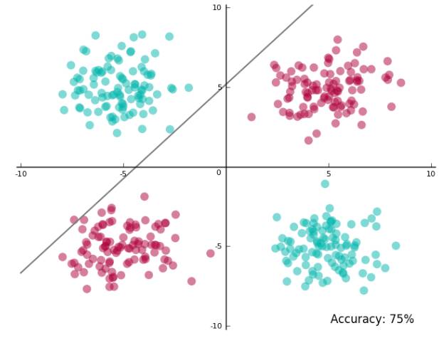这样的结果并不怎么样,在训练数据中只能得到 75% 的准确率,这是使用决策边界能得到的最好结果。此外,决策边界和一些数据点过于接近,甚至将一些点分割开来。