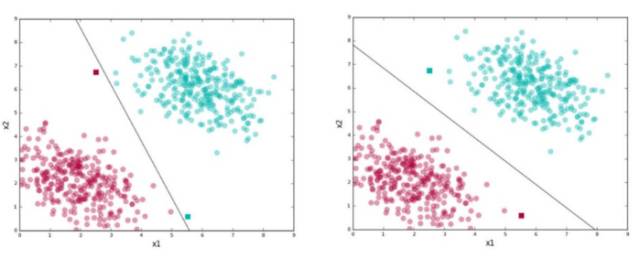 而第二的点就没有这样的问题。例如,下图为两个分类器分离方块点群集的结果展示。