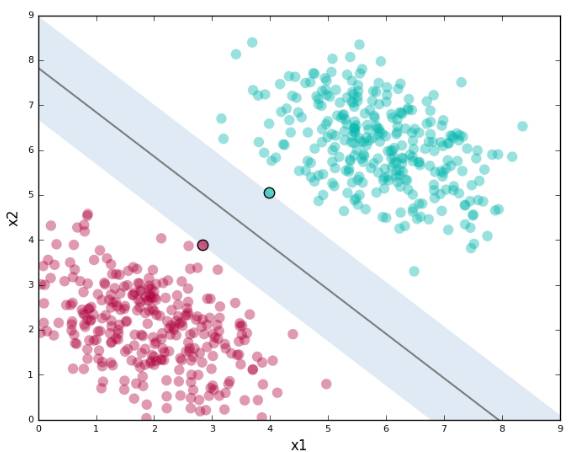 那些定义了这条决策边界的最近邻点被称作支持向量。而决策边界周围的区域被定义为间隔。下图展示了支持向量和对应的第二条决策边界:黑色边界的点(有两个)和间隔(阴影区域)。