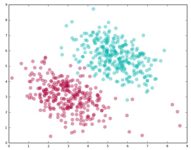 点的颜色(绿色或者红色)表示学生在机器学习课程中的表现:「好」或者「坏」。将图画出来的话应该是这样的: