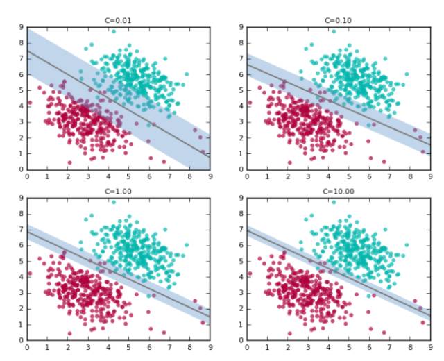 必需强调一下这是一个权衡的过程。如果想要更好地分类训练数据,那么代价就是间隔会更宽。以下几个图展示了在不同的 C 值中分类器和间隔的变化(未显示支持向量)。