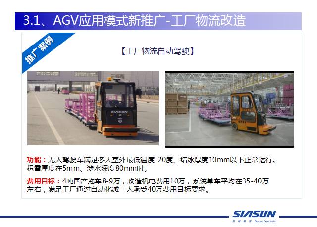 这个产品是我们今年年初开始在英菲尼迪工厂开始实施,它的特点就是把国产的4吨拖车拿到沈阳进行了一些无人化改造,AGV适合低温状态、结冰,包括积雪、涉水都是没有问题的,这是真正实现户内户外物料的输送。