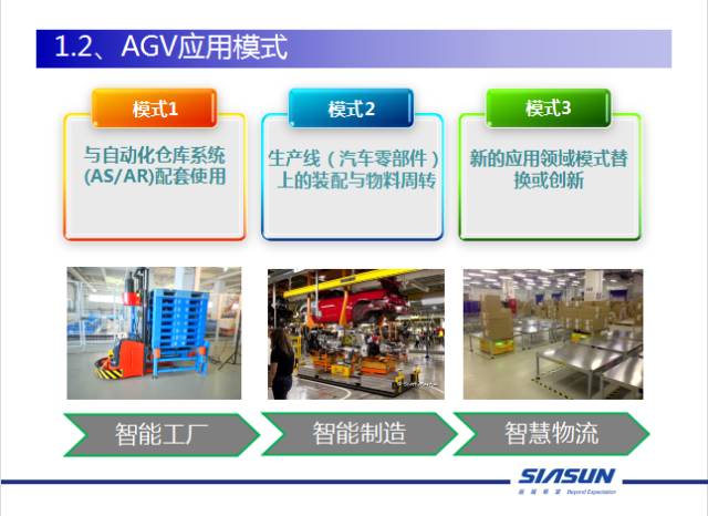 整个AGV的应用模式,传统是两种模式,一个是与自动化立体仓库的对接,比如激光叉车,还有就是一般工业生产线上的物流装配与物料周转,像汽车装配线,包括汽车物料输送。第三种模式,主要是一些AGV新的应用领域的模式替换和创新。比如说比较火的,像智能停车库、电子商务无人仓。总而言之,AGV这种产品主要还围绕着工业4.0智能工厂、智能制造、智慧物流这三大主题展开。