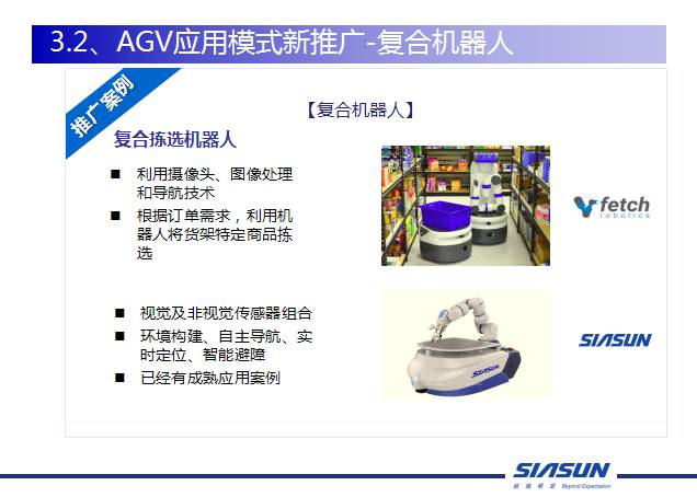 第二个推广的案例是AGV行业比较推崇的复合型机器人。复合型机器人就是把我们传统的机械臂放在AGV车上进行物料的抓取或拣选工作。目前新松搭建机械臂属于新型七轴机械手,这是属于人机交互的机械臂,人和机器互为交互。
