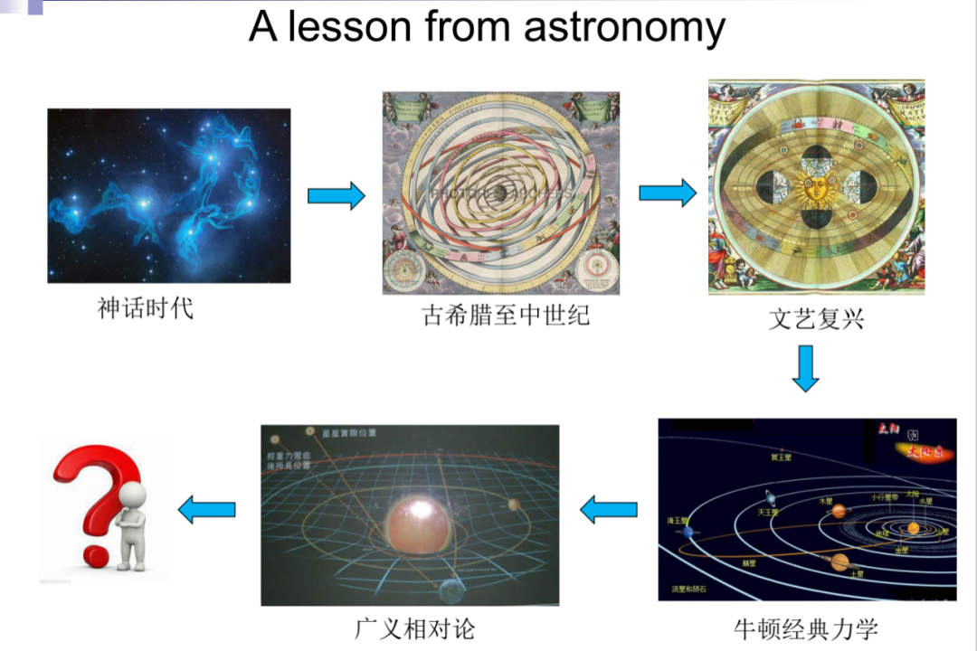 首先我们考虑一个非常古老的视觉问题:从星图预测天体的轨迹。可以说几千年来我们的目标是构造一个可解释模型去解释天体的运动。从天文学的发展历程,我们可以获得一定的启发:在上古时期的神话时代,人类是靠神学来解释星辰是如何运动的;接着从古希腊到中世纪是以托勒密地心说为代表的理论来解释,然后到文艺复兴的日心说,牛顿力学揭示椭圆轨道的物理理论,最后再到广义相对论。