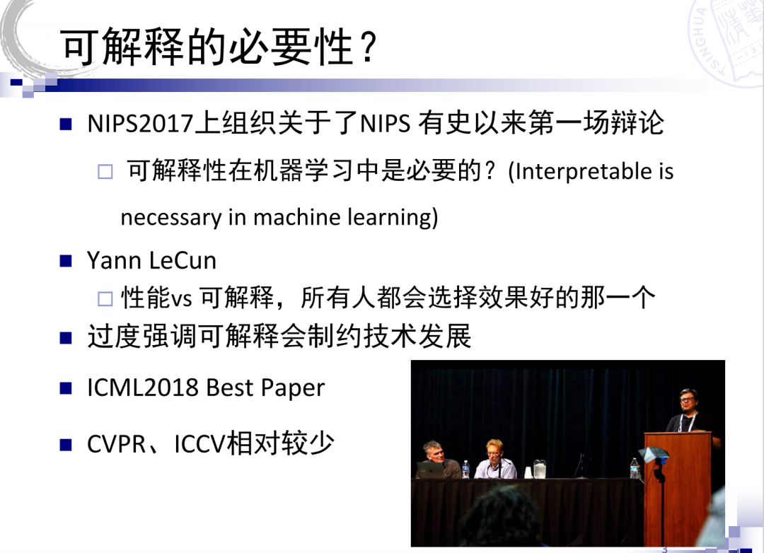 首先是为什么做可解释。刚才林老师也谈到了,NeurIPS2017上组织过一次辩论,就是关于可解释对机器学习的必要性,当时深度学习的三巨头之一LeCun教授的观点非常明确,在性能和可解释之间多数人都会把性能作为优先的选项。但是,ICML 2018的Best Paper颁给了可解释的研究,然后最近IJCAI,AAAI也都组织过相关的研讨会,说明可解释学习已经引起了学术界的广泛关注。