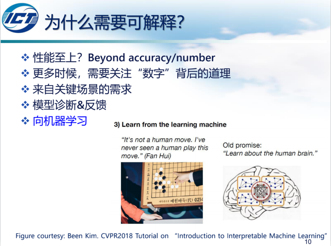 反过来,什么不是可解释性的目的呢?来自Google Brain的一位学者Been Kim给出了她的观点,她认为研究可解释性,并不意味着需要让所有的模型都可解释,而是取决于使用者所要解决的任务和目标。比如说AlphaGo,它学习下棋的方式完全不同于人类,但它把所有人都打败了,它可能并不具有可解释性。可解释性不意味着去试图理解模型中的每一个single bit,不是去刨根问底、去理解到最底层的每个字节、每个比特。同时,可解释性也不意味着它与复杂模型的设计是抵触的。再一个,可解释性并不仅仅为了给使用者带来可信赖的、公平的模型,在此之上还有更多的需求。