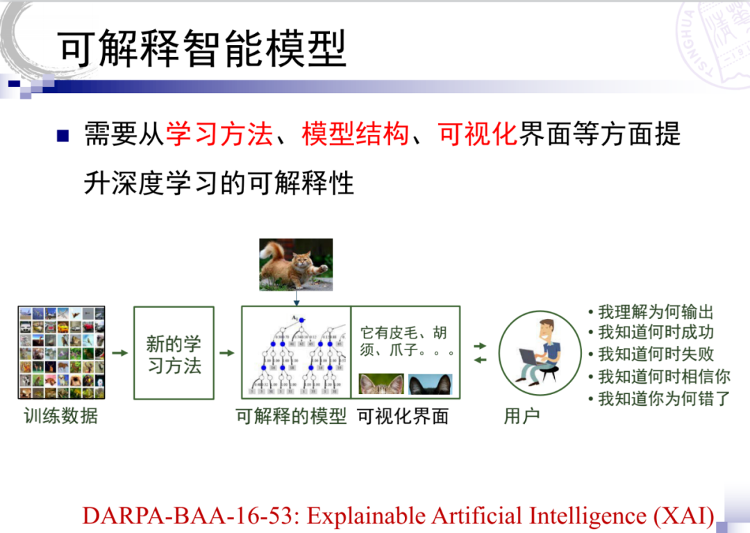接下来说一下可解释模型是什么?这里我引用了DARPA的目标,希望能够从学习方法、模型结构、可视化等方面提高模型的可解释性。我个人的理解是可解释有几个不同的维度。第一,其实我们可以把它叫做