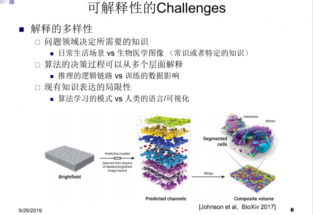 ,比如说从显微镜的图像里建立细胞的模型,这是一个生物影像的问题。我们发现生物学家很希望我们用深度学习的方法时都有一些可解释性。但特定领域的问题所需要的知识非常不同于日常生活场景,因为它们的层次是不一样的。