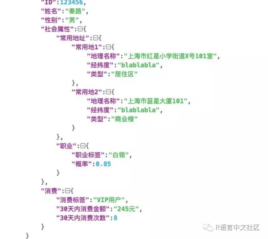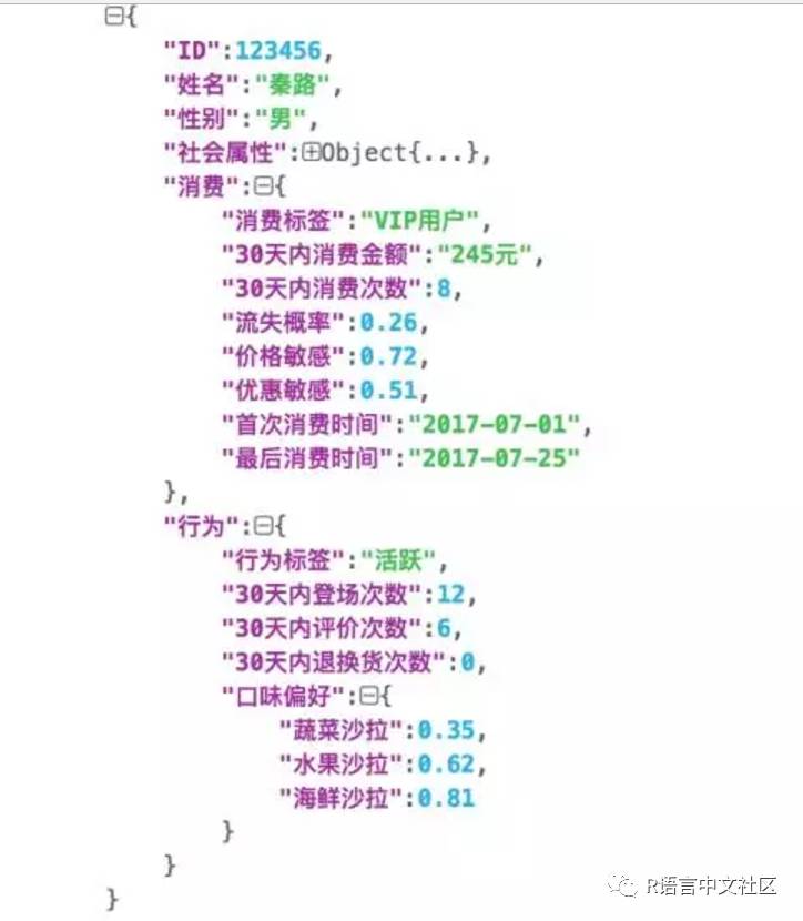 为了便于大家理解,我用JSON格式表示一个简易的用户画像。