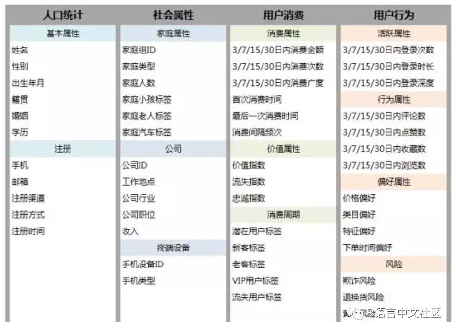 用户画像一般按业务属性划分多个类别模块。除了常见的人口统计,社会属性外。还有用户消费画像,用户行为画像,用户兴趣画像等。具体的画像得看产品形态,像金融领域,还会有风险画像,包括征信、违约、洗钱、还款能力、保险黑名单等。电商领域会有商品的类目偏好、品类偏好、品牌偏好,不一而足。