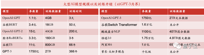 举个例子,比如像open AI GPT,只需要3张英伟达的A100训练三天,但使用单卡,就需要训练366年。像GPT-3模型,则需要1024张80GB的显卡,训练一个月,训练成本超过1200万美金。如果训练北京智源研究院的“悟道”模型,整个花费也是达数千万美元。图1所示:我们可以看到以GPT-3为界,左边这个图里模型到了GPT-3以后,switch transform、悟道、阿里M6等等都是千亿到万亿的模型参数计算量。