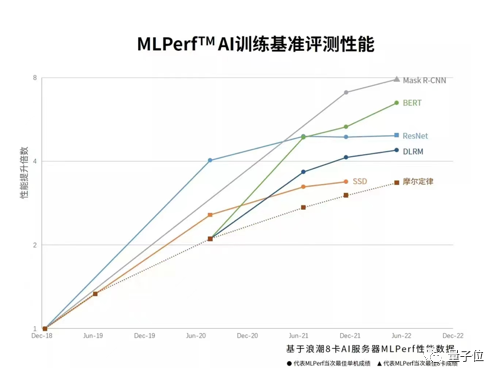 而从另外一个维度看,能够提升芯片性能的,无非就是制程和架构。图2是展示了基于浪潮8卡AI服务器做MLperf性能数据,计算性能已经超过了摩尔定律发展,这意味着架构创新起了非常大的作用。随着时间的推移,芯片架构创新对性能提升的影响会越来越大。性能的提升跟摩尔定律的“剪刀差”会越来越明显。