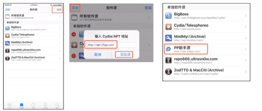 步骤1、添加软件源(不同软件的软件源可能不同),下面以 pp助手源:http://apt.25pp.com 为例