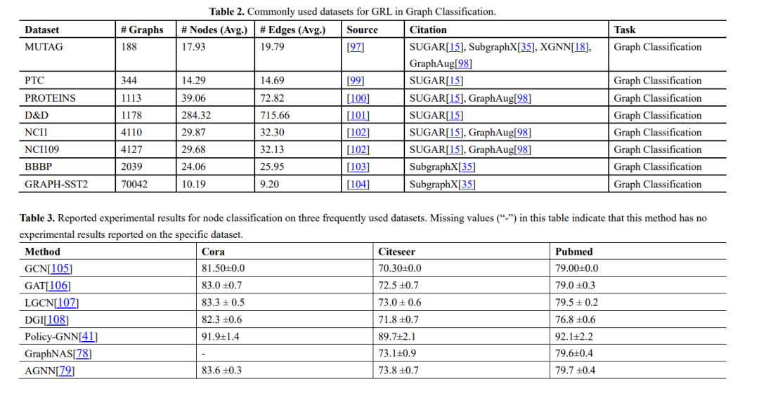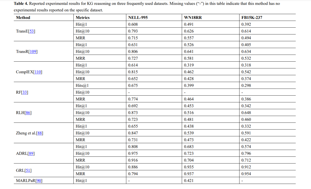 我们提供了在本综述中引用的这些研究中使用的实验数据集的总结,以及数据集、来源、任务和使用这些数据集的方法的统计信息列表,如表1和表2所示。此外,我们总结了Cora、Citeseer和Pubmed上的节点分类实验结果,以及NELL995、WN18RR和FB15K-237上的知识图推理结果,其中,分类精度是节点分类任务的评价指标,Hit@1、Hit@10、和MRR为知识图推理的评价指标,如表3和表4所示。