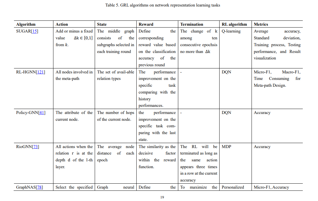 本综述的其余部分组织如下。第二节简要介绍了本文讨论的图数据挖掘概念,并简要回顾了GRL研究中常用的关键算法。在第三节中,我们回顾了目前关于GRL的一些研究,并列出了该研究的状态、行动、奖励、终止、RL算法和评价指标。在第四部分,我们讨论并提出了一些未来的研究方向和挑战。最后,我们在第5节对本文进行了总结。