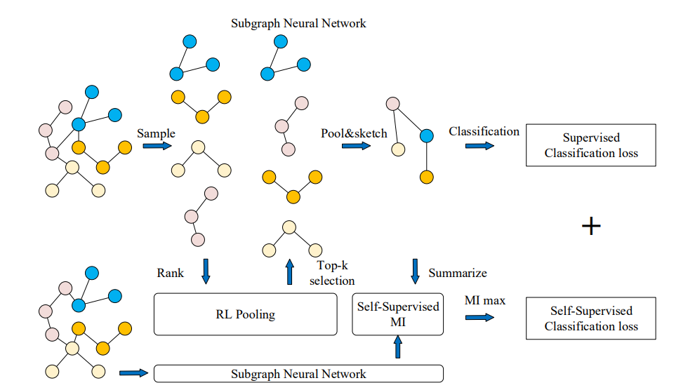 网络表示学习是学习一种映射,将图的节点嵌入为低维向量,同时编码各种结构和语义信息。这些方法旨在优化表示,使嵌入空间中的几何关系保持原始图的结构[111,112]。得到的向量表示可以有效支持节点分类、节点聚类、链接预测和图分类等广泛任务[113,114]。现有的网络嵌入方法[15]普遍存在三个问题: (1) 特征识别能力差。融合所有的特征和关系来获得一个总体的网络表示,往往会带来过度平滑的潜在问题,导致图的特征难以区分。(2) 对先验知识的需求。以相似度量或主题的形式保存结构特征总是基于启发式,并需要大量的先验知识。(3) 低explainability。许多方法通过逐步池化来利用子结构,这会丢失大量详细的结构信息,并导致下游任务缺乏足够的可解释性。为了解决上述问题,SUGAR[15]通过Q-learning自适应地选择有意义的子图来表示图的区别性信息,从而保留了“节点-子图-图”级别的结构信息,这种分层学习方法提供了强大的表示、泛化和可解释性。