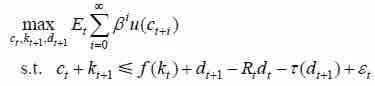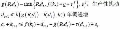 其中,c、k分别为消费和投资;d为借贷额,为正代表借款,为负代表放款;R为利率;τ (d) 为借贷交易成本,按一般情形可设为固定成本;ε为随机扰动,不妨设它存在一些独立的来源,且其一是偿债风险,所以它的方差(令为Ω)与同期的d存在相关性。上述问题可以由标准方法求解。对于完全竞争市场,假设值函数形如V(k, d),并将其精确到泰勒展开的二阶项,则可得到与常见形式接近的实际利率表达式: