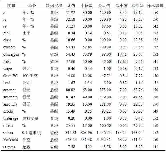 对于贫富差距这一关键的解释变量,当时并未估算基尼系数之类指标,也未提供可直接用于计算相关指标的收入分配数据,但报告了田场面积的组别分布。若设农户的劳动收入相对较平均,收入差距主要来源于土地经营,则可估算田场面积的基尼系数(gini)来近似地替代收入差距。至于放贷人的阶级属性,可觇于借贷来源一项,其分类为:同村人、亲友、富户、商人、农人、典买、店铺、城市或附近城市、地主、邻人、邻村、其他、未详。而在实业部中央农业实验所(1936)以《农情报告》系列发布的另一重要调查里,所取类别则为:银行、合作社、典当、钱庄、商店、地主、富农、商人。相比之下,前者可能更接近农村的实际,但是也更加模糊。因为,同村人、亲友、富户、地主等身份极可能是重合的,而从报告的数据来看,在发生重合时,调查人很可能只是权宜填取一种。例如,江苏武进在第二次调查时,借贷来源59%为亲友,38%为地主,第三次却骤变为亲友占80%,地主为0。这里假设填报中的权宜是随机的,则该项数据仍可用于回归,只是对估计结果的有效性应保持谨慎。又,按照传统的观点,富户、地主、商人的高利贷都可能具有剥削性,兹以它们的总和(class)来衡量放款人中“剥削阶级”的比重。此外,《农情报告》的前四项为非个人放贷,它的比例越高,意味着农村获得资金的渠道越多,也意味着传统的“剥削阶级”市场势力越受到限制。所以,为了弥补卜凯分类的不足,回归中亦参用《农情报告》的数据,将非个人放贷比例(finst)作为省级属性引入。