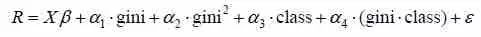 其中,X为控制变量,包括收入、借贷规模、影响契约执行的制度环境等影响补偿利率的常规因素;gini为基尼系数,是对贫富分化的衡量。如前所述,在控制了借贷规模的条件下,它的作用主要体现在提高借款穷人的补偿利率和增强放款富人的市场势力上,所以应该会对利率有正向影响。需要注意的是,由于贫富分化对补偿利率的边际影响不太可能是递减的,它与市场势力形如式(5)的交织将导致正的平方项。这时,倘若α2不显著,那么,或是垄断势力不显著,或是双方从规模效应中的收益抵消了垄断的影响。无论如何,这都意味着高利贷与贫富分化的正反馈或恶性循环被打破,高利贷也就不再是贫困陷阱的“罪魁祸首”。考虑到在市场势力之外,“剥削阶级”还可能运用超经济手段,为了对此进行检验,回归式中用class代表向“剥削阶级”借款的比重,引入了放款人的阶级成分。由于超经济手段的运用受制于经济条件,故同时引入gini和class的交叉项。最后一项为随机扰动,诸如偏好差异、对均衡的偏离等因素都可以归入其中。
