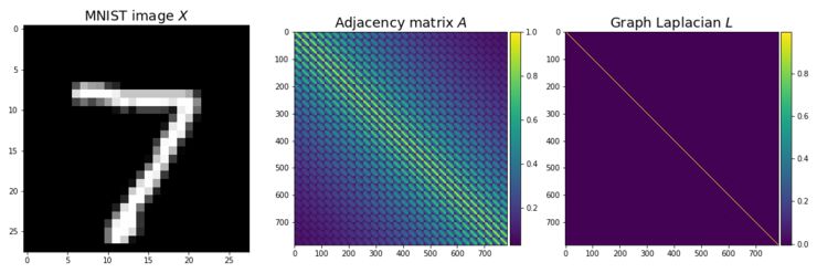 图6:MNIST图像定义了28×28的规则网格特征X(左)、相邻矩阵A(中间)和拉普拉斯算子(右)。拉普拉斯图看起来像一个单位矩阵的原因是该图有相当多的节点(784),因此在归一化之后,对角线外的值比1小得多。