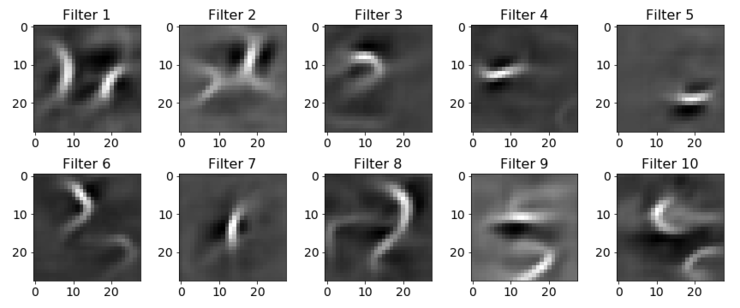 图12:具有技术支持的滤波器通常是用于频谱卷积。在这种情况下,这些是使用带有单个卷积层的ConvNet学习的28×28滤波器,其后是ReLU,7×7 MaxPooling和完全连接的分类层。 为清楚起见,由于零填充,卷积层的输出仍为28×28。 令人惊讶的是,该网络在MNIST上达到了96.7%。 这可以通过数据集的简单性来解释。
