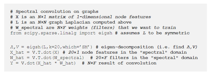 因此,给定拉普拉斯图L,节点特征X和滤波器W频谱,在Python频谱卷积图上看起来非常简单:
