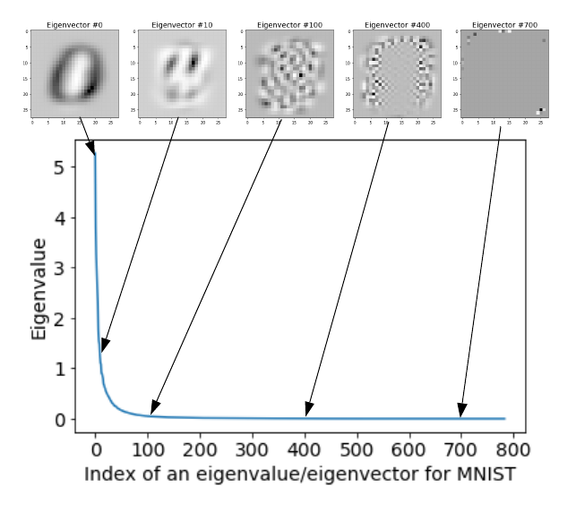 图7:MNIST数据集的特征值(降序)和对应的特征向量。