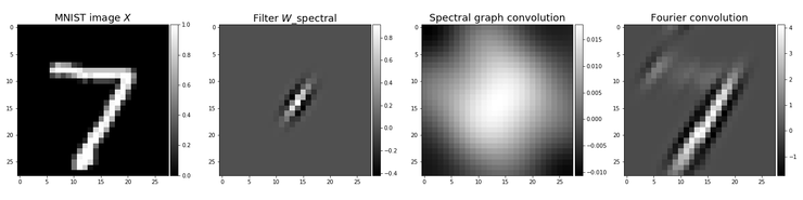 图15:从左到右:(1)输入图像。(2)有效宽度小的局部滤波器,多数数值值无限接近于0。(3)数字7的MNIST图像与滤波器的频谱图卷积结果。(4)利用傅里叶变换进行频谱卷积的结果。这些结果表明,频谱图卷积对图像的应用是非常有限的,这可能是由于拉普拉斯基相对于傅里叶基的空间结构较弱所致。