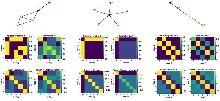 图5:相邻矩阵,拉普拉斯算子及随机功率图(左),“星状图”(中间)和“路径图”(右)。我将A 2规范化,使得每行之和等于1,从而得到了一个关于2-hop连接的概率解释。注意,拉普拉斯算子及其功率是对称矩阵,这使得特征分解更容易,并且便于在深度图网络中进行特征传播。