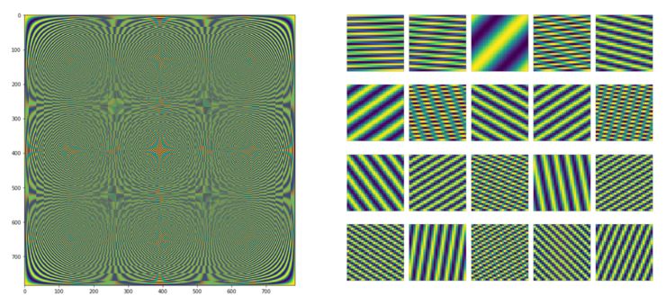 图1:左边的傅里叶基(DFT矩阵),其中每列或每行是基向量,重新整合成28×28(如右边所示),即右边显示20个基向量。傅里叶基利用计算频谱卷积进行信号处理。如图所示,本文采用的正是拉普拉斯基方法。