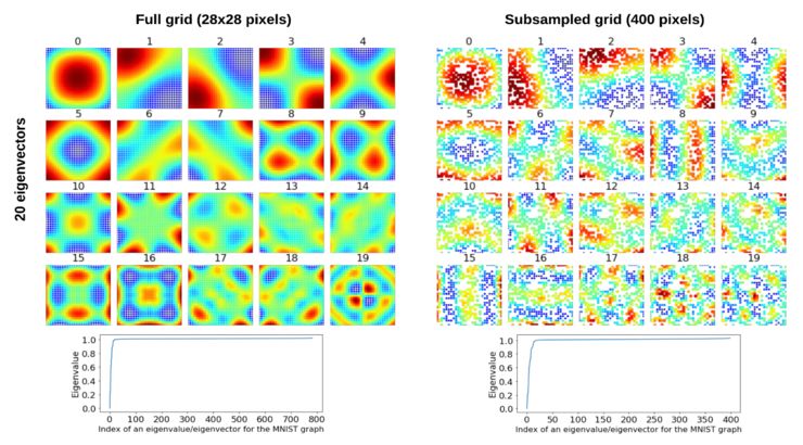 图8:拉普拉斯图 L的特征值Λ(底部)和特征向量V(顶部)。根据Bruna等人2014年在ICLR 2014(右)的实验,对一个规则的28×28网格(左)和400个点进行随机采样。给出了对应于20个最小特征值的特征向量。特征向量在左侧为784维,右侧为400维,V分别为784×20和400×20。在左侧的20个特征向量中,每个特征向量被重新更改为28×28,而在右侧,将400维特征向量更改为28×28,为缺失的节点添加白色像素。因此,每个特征向量中的每个像素对应于一个节点或一个缺失节点(右侧为白色)。这些特征向量可以看作是我们分解图形的基础。