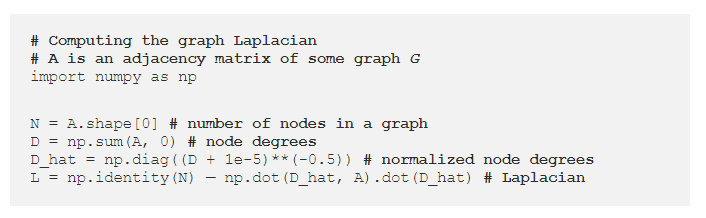 在后面的文章中,我将假设“对称归一化拉普拉斯算子”,它经常用于图神经网络中,因为它是规范化的,所以当你叠加许多层图时,节点特征会以一种更平滑的方式传播,不会造成数据爆炸,特征值或梯度也不会消失。原因是它是基于图的相邻矩阵A进行计算的,可以在几行Python代码中完成,如下所示: