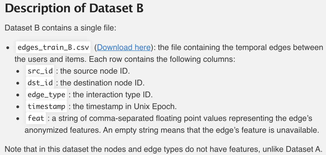 本次比赛给了2个动态图数据集A和B,一个是时间图,一个是用户-商品交互图,其边都带有时间信息。
