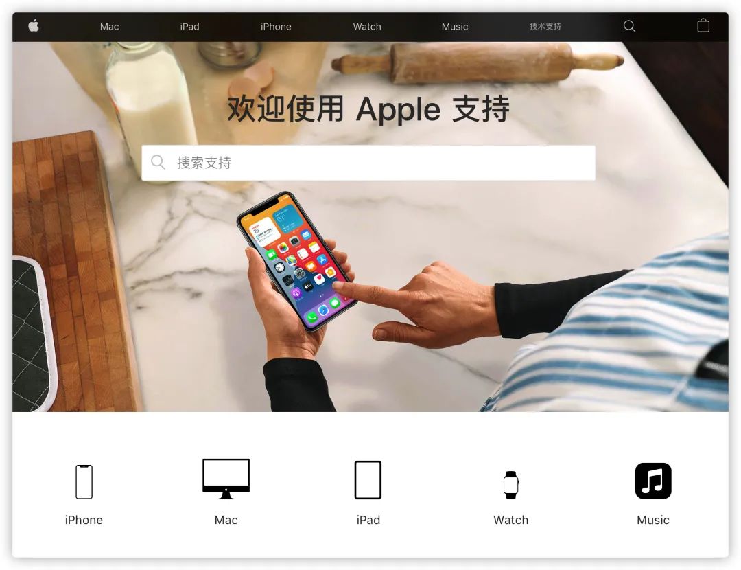 以苹果中国官网为例,顶部横幅除了展示 Mac、iPad、iPhone 等产品线以外,最右边还包括了「技术支持」,该页面是面向消费者的官方技术支持工具,你可以按照产品类别或者服务类别找到相应的解决方案。