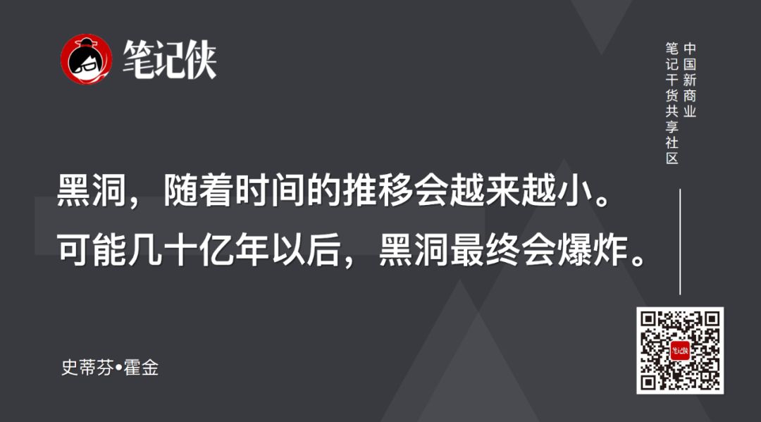 黑洞并不是黑的,也不是一成不变的,相反,黑洞一直处于动的状态。霍金发现黑洞是会蒸发的,不断地辐射,所以,随着时间的推移会越来越小。可能几十亿年以后,黑洞最终会爆炸。