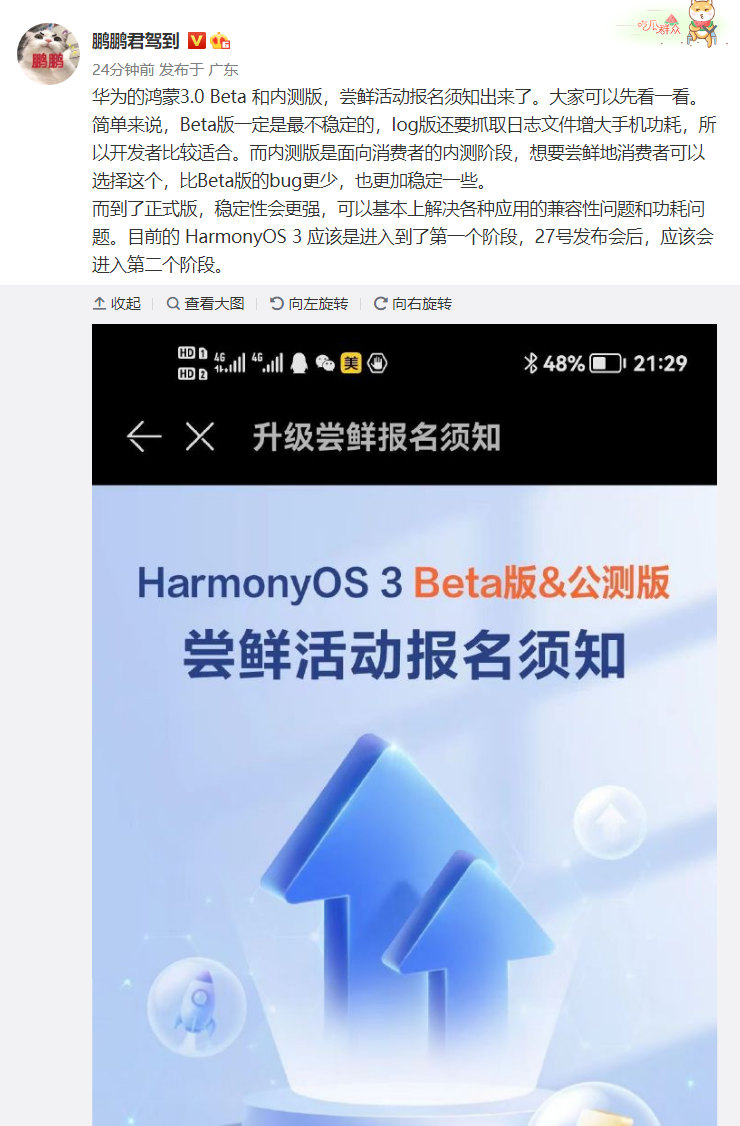 据数码博主 @鹏鹏君驾到 表示,Beta 版是最不稳定的,log 版要抓取日志文件会增大手机功耗,所以开发者比较适合。而公测版是面向消费者的内测阶段,想要尝鲜的消费者可以选择该版本,比 Beta 版的 Bug 更少,也更加稳定一些。而正式版稳定性会更强,可以基本上解决各种应用的兼容性问题和功耗问题。目前的 HarmonyOS 3 应该是进入到了第一个阶段,7 月 27 号发布会后,应该会进入第二个阶段。